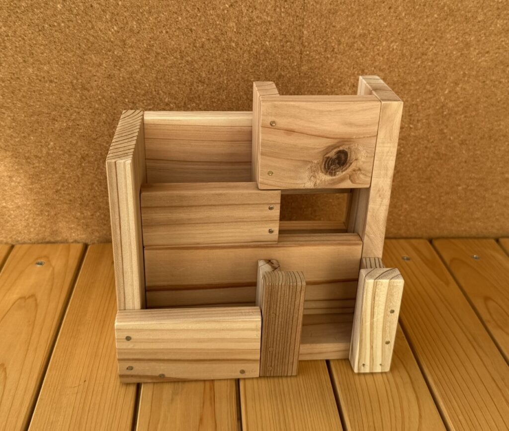 机の連結木箱の拡大版、ヒノキで作るA4パイプファイルが入るサイズの連結木箱。