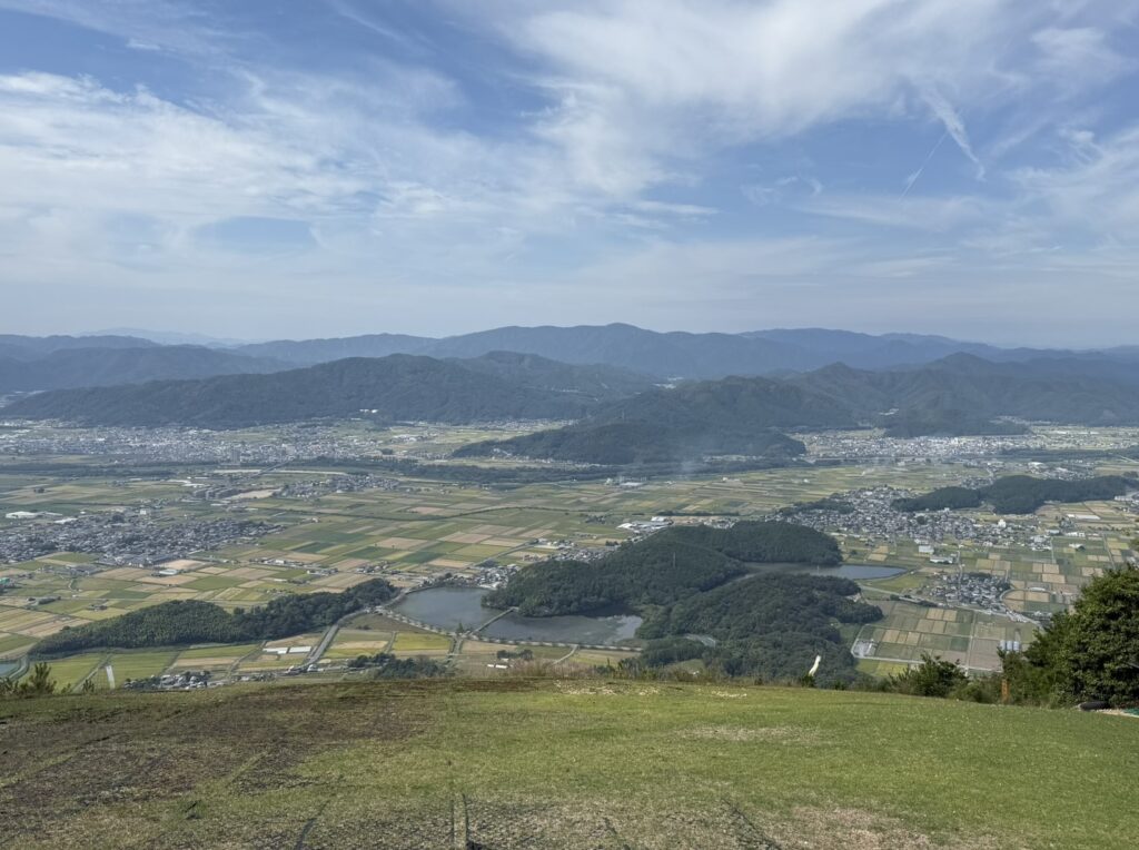 「わぁ。見晴らしがいいところに出た!」薄雲のかかったきれいな空の下、亀岡が広がっていました。