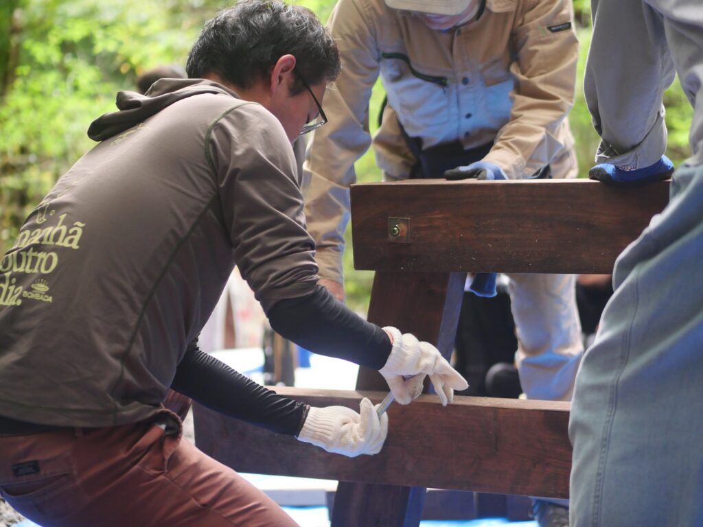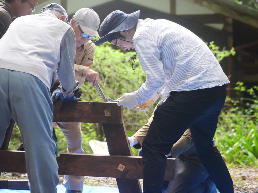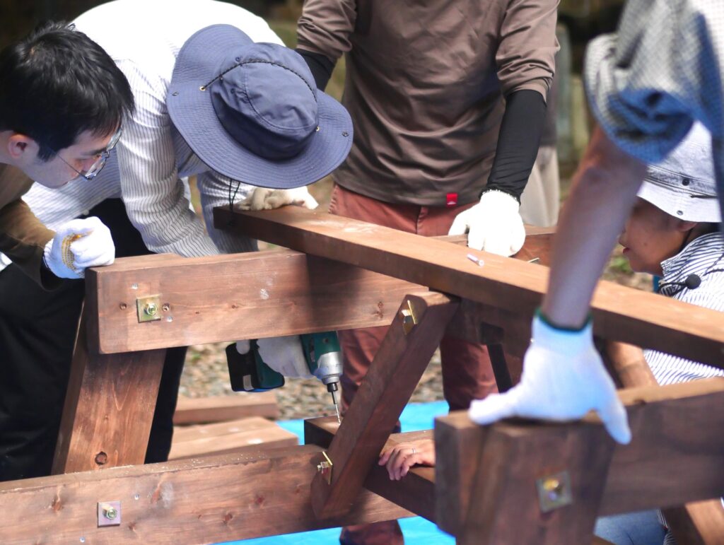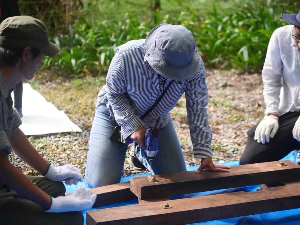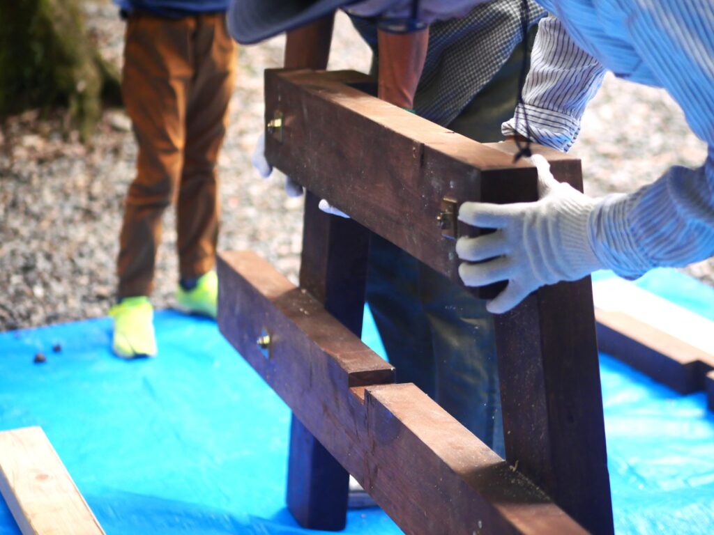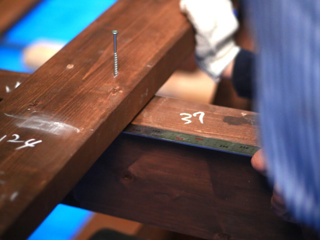 斜めの補強材も取り付けて、テーブルベンチの骨格を頑強に仕上げていきます。