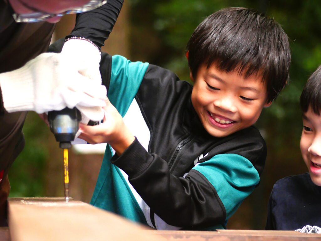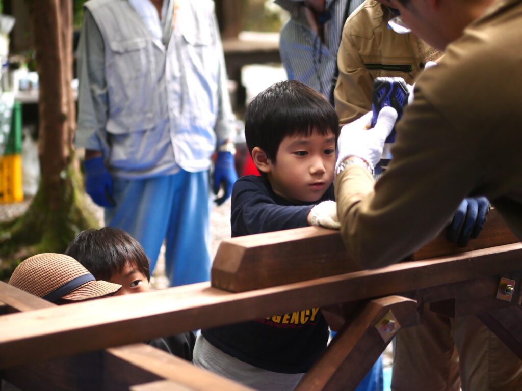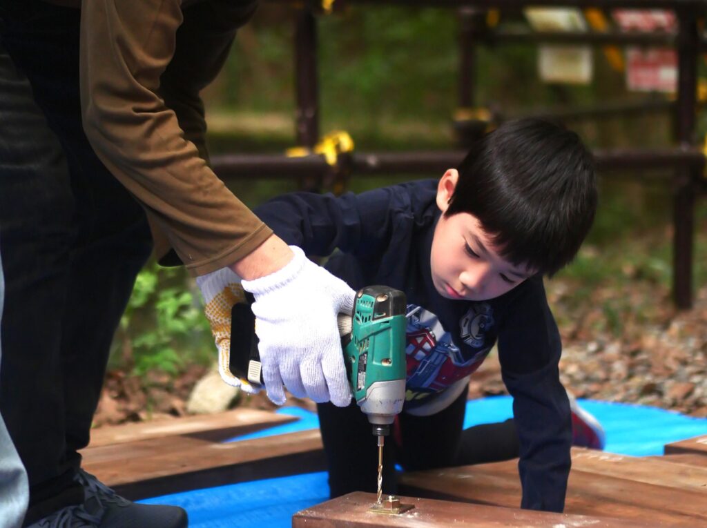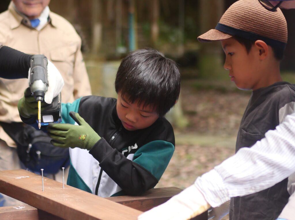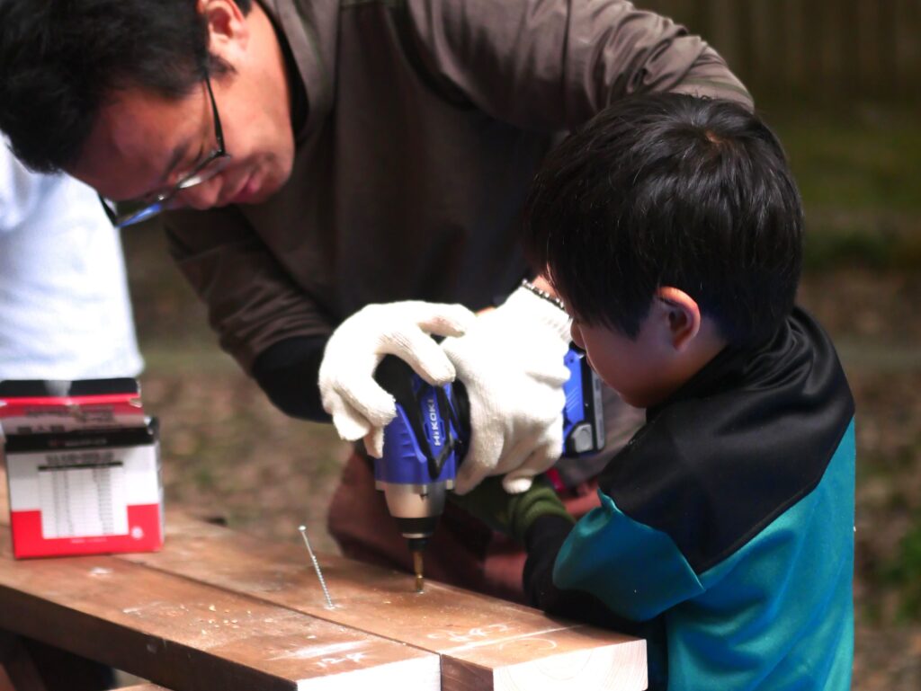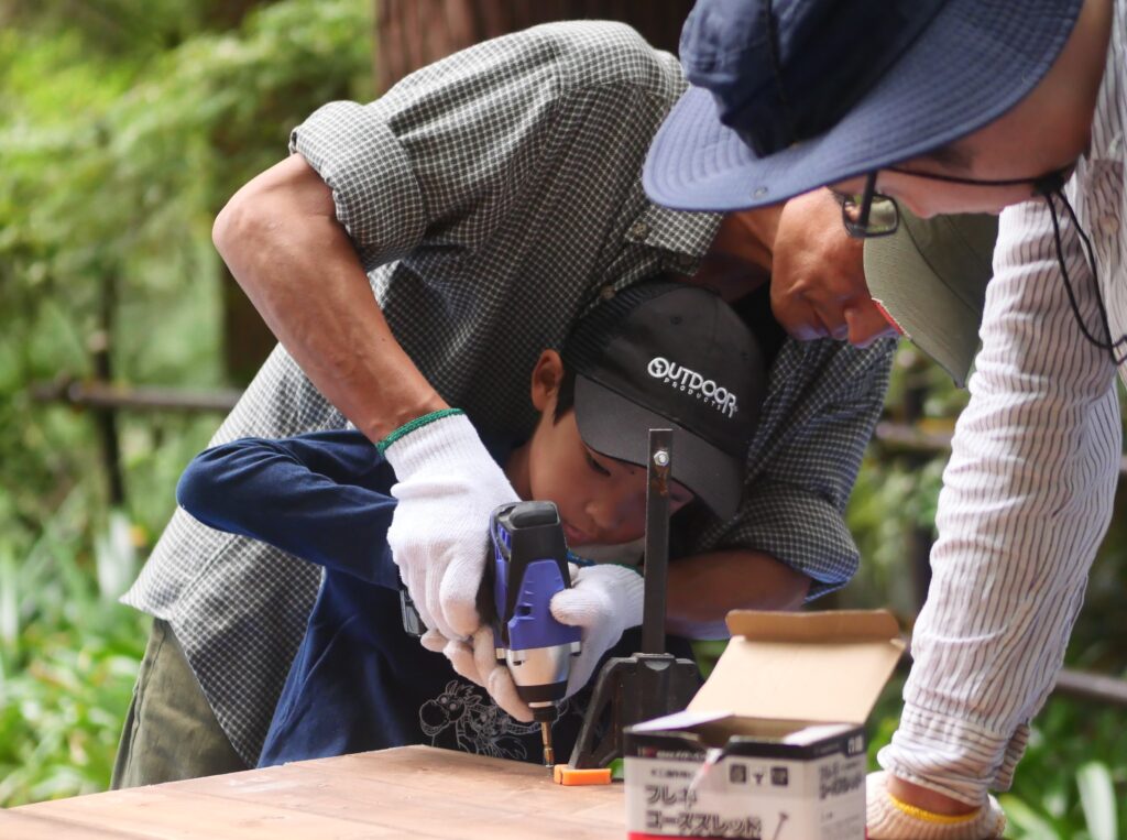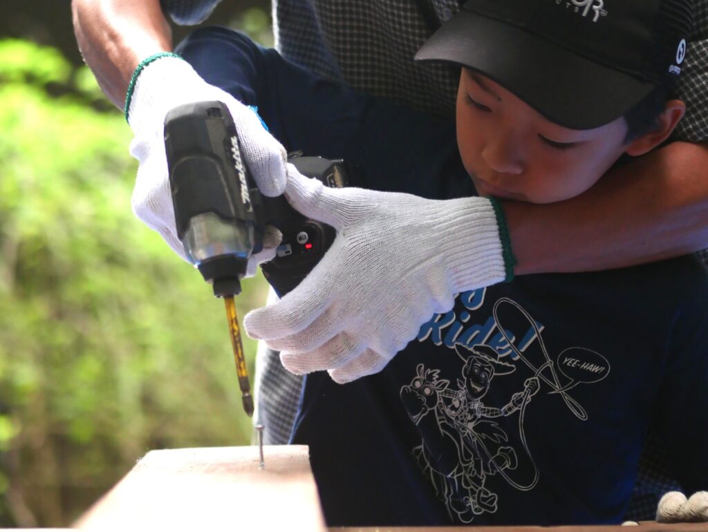 子どもさんと一緒になって、木ネジを打ち込んでいきます。