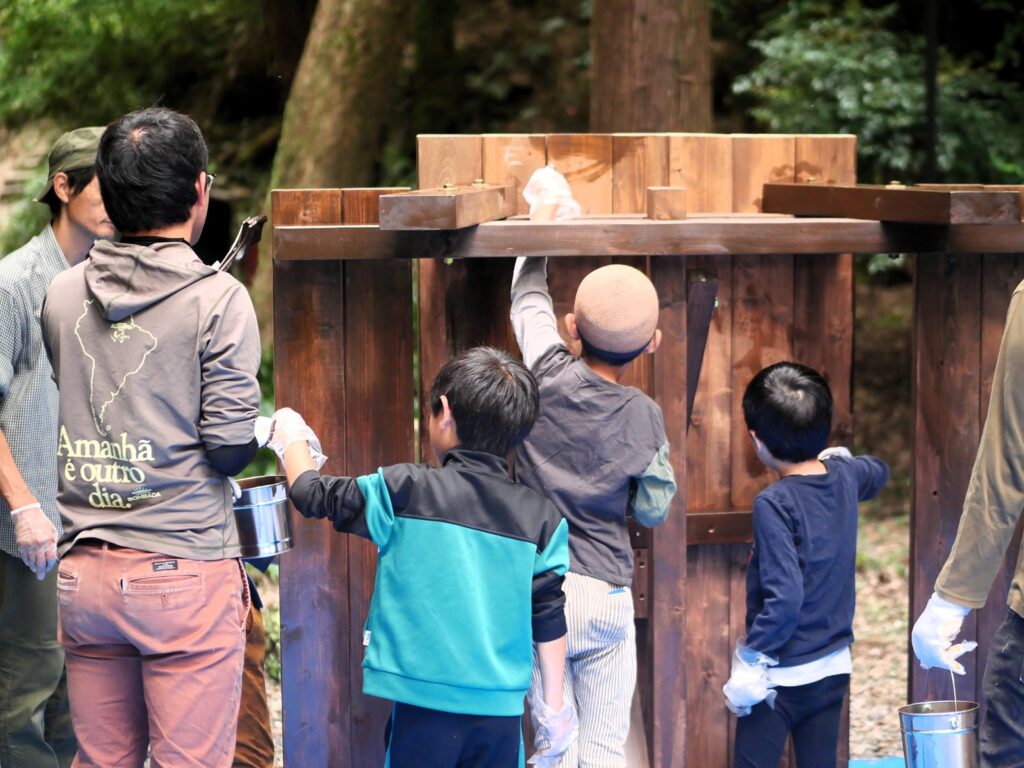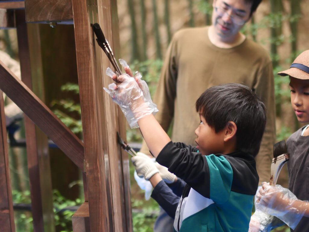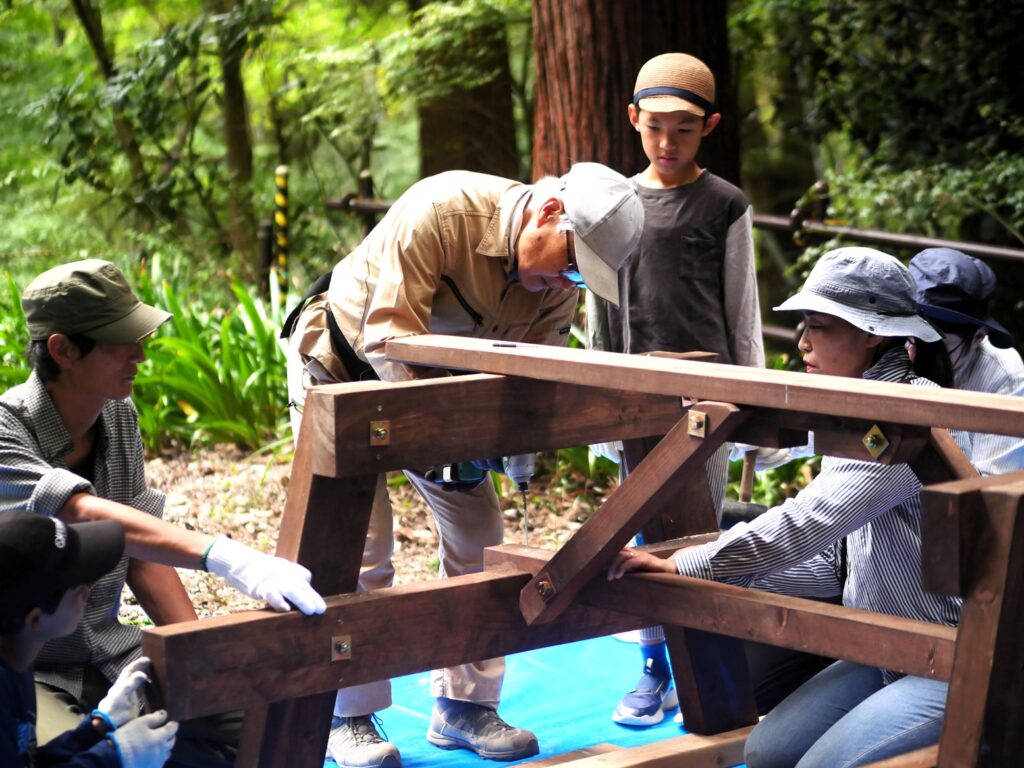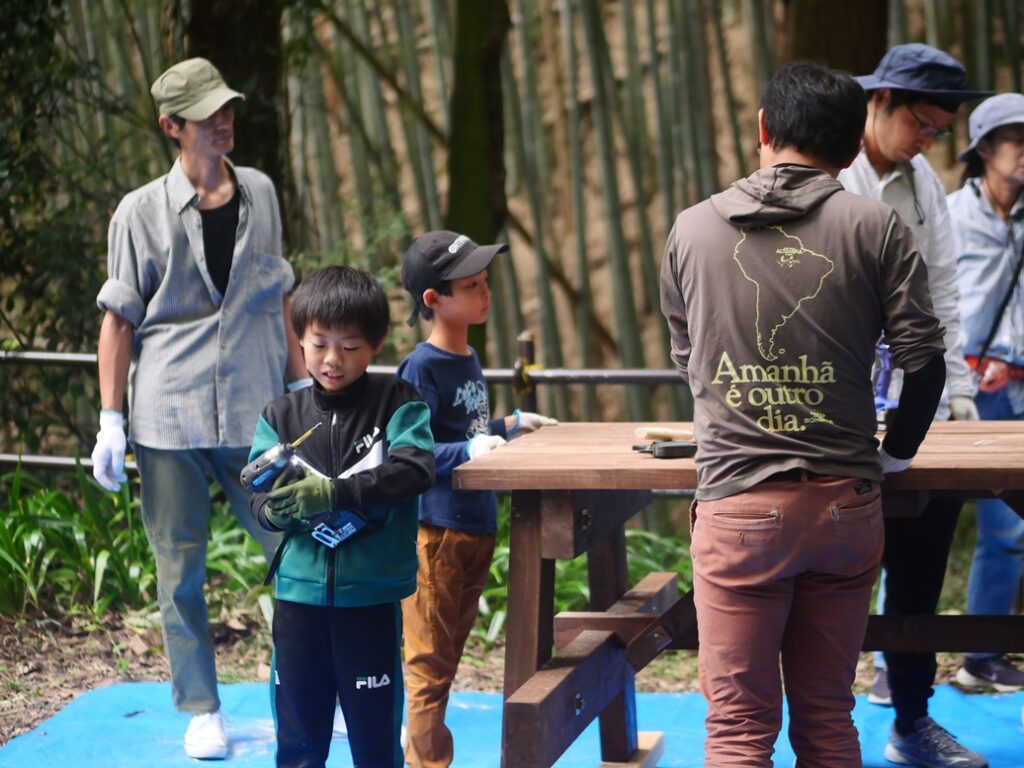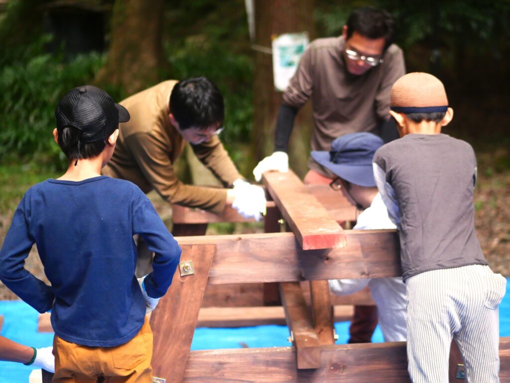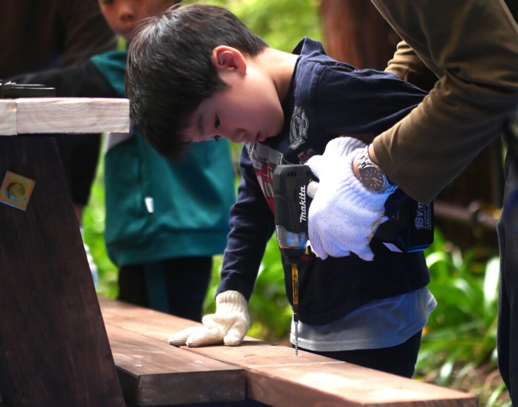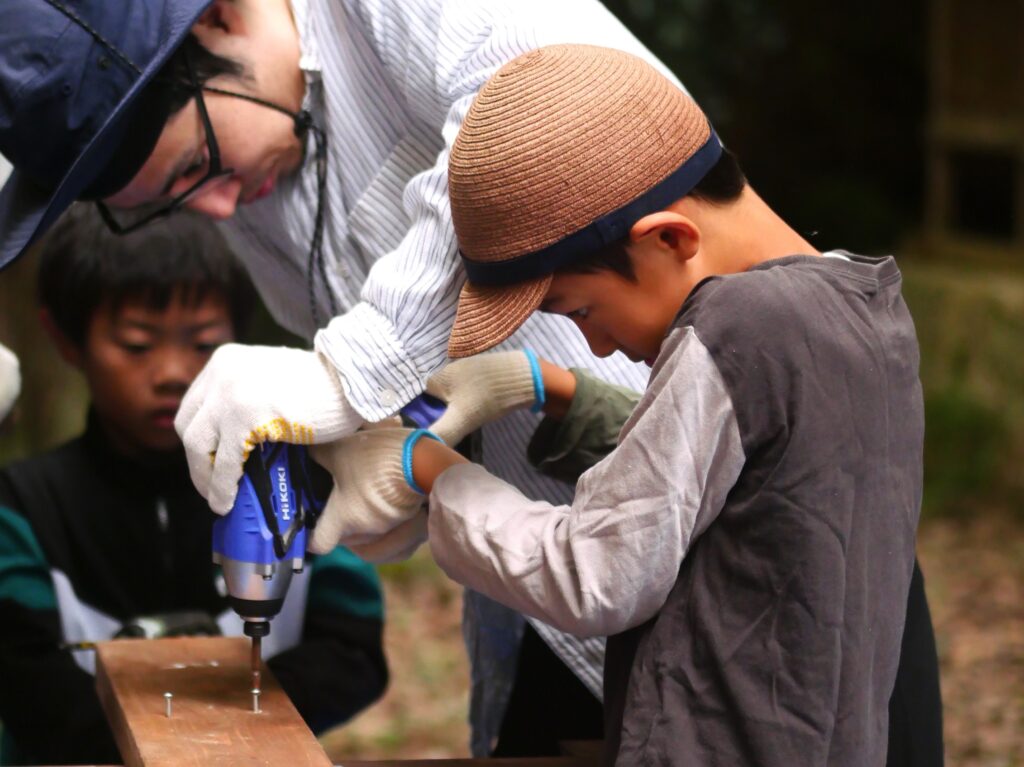 子どもさんと一緒になって、木ネジを打ち込んでいきます。