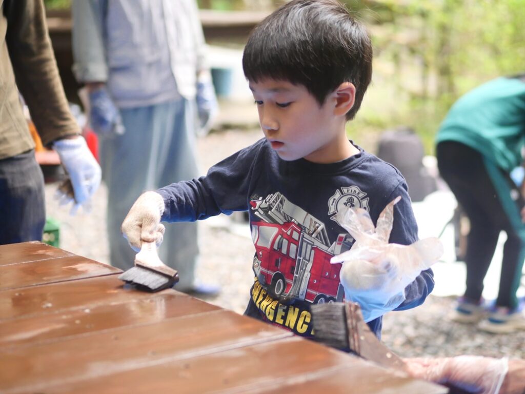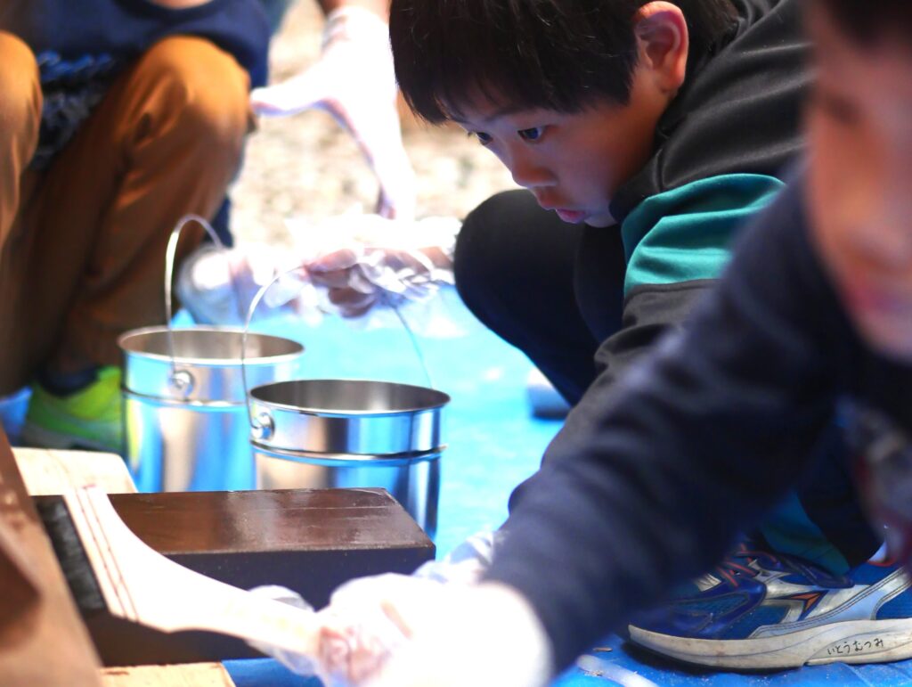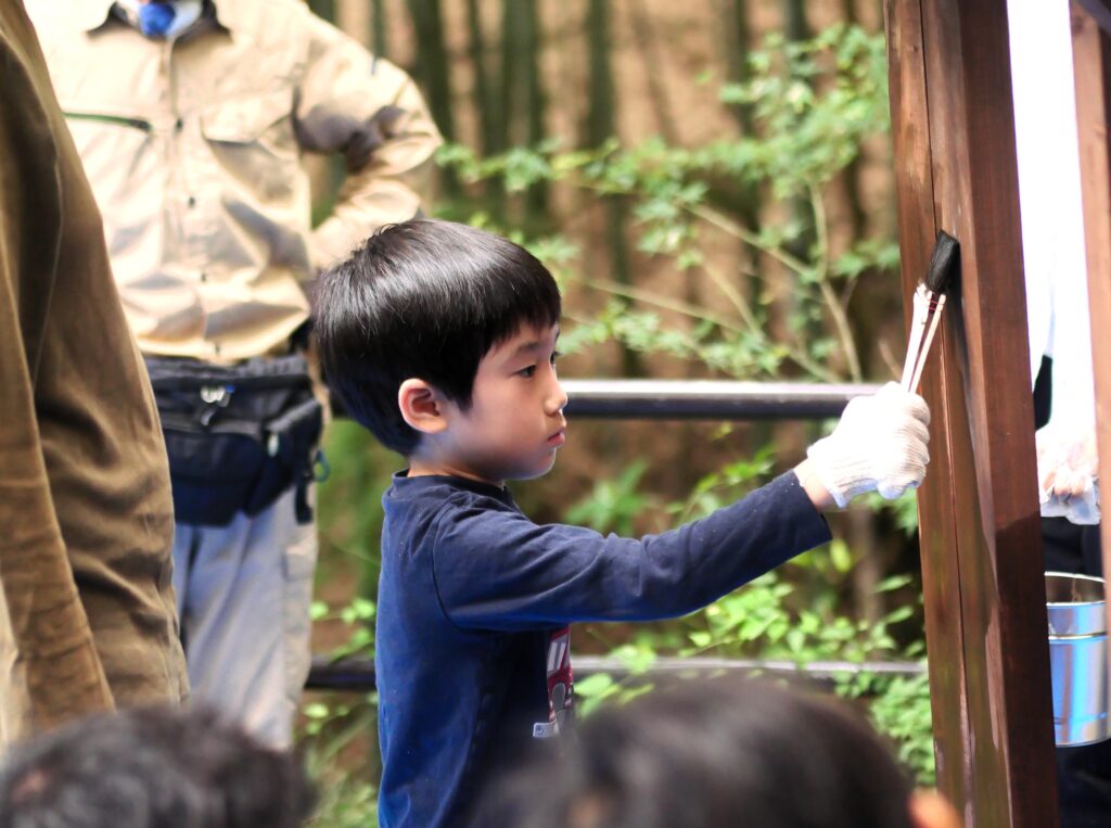 背が高い子が手を伸ばしてしっかり高いところを塗ってくれています。みんな、真剣!