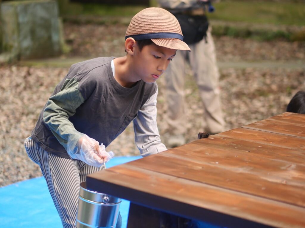 しっかり塗れたみたいなので、テーブルを元来の向きに倒します。あ、塗り残し?僕、塗っとくよー。