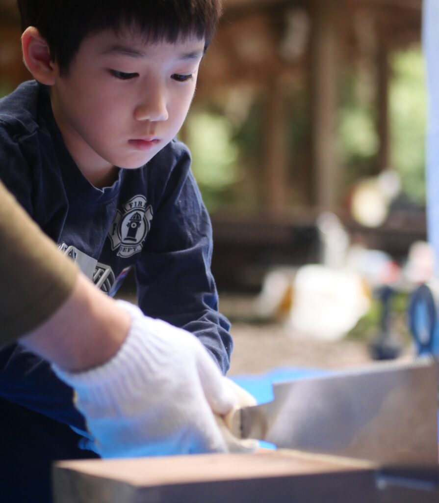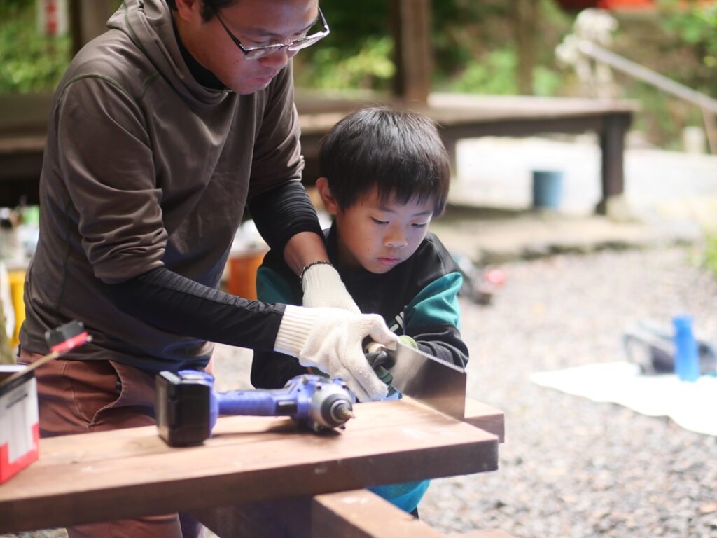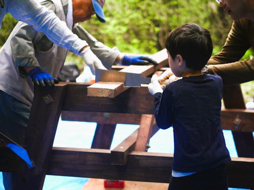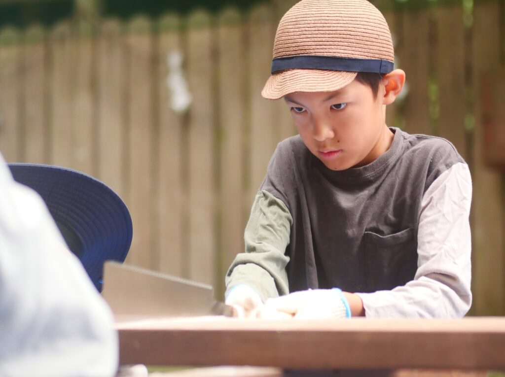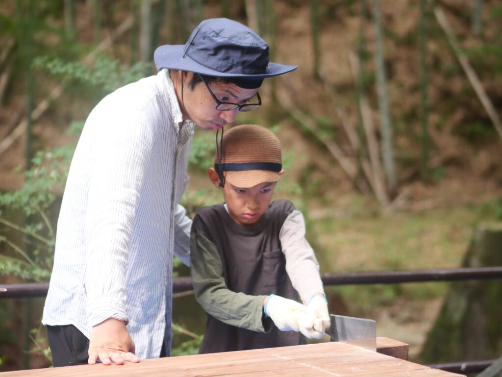 のこぎりの持ち方とか、お父さんに教えてもらって、お父さんに手伝ってもらっています。