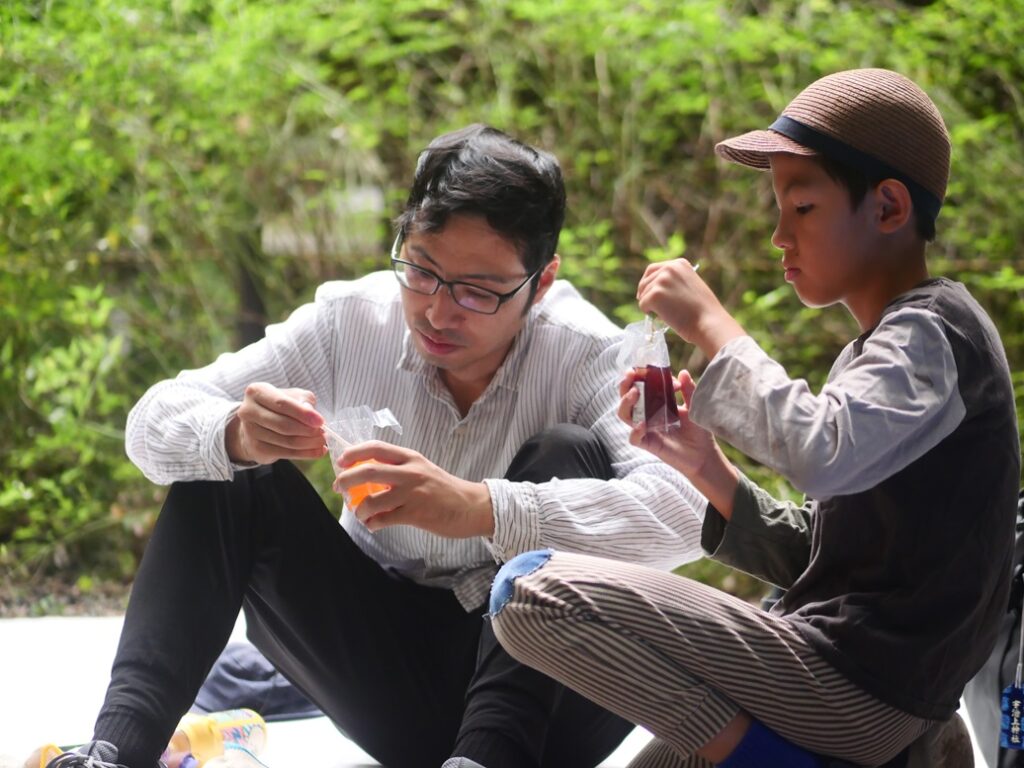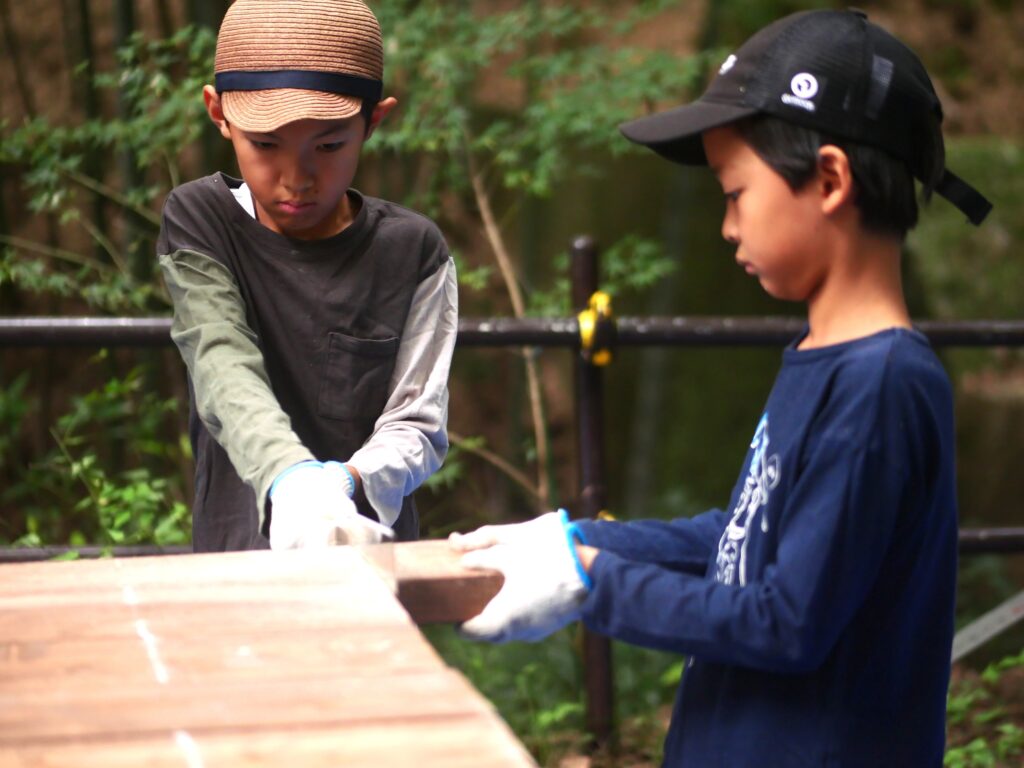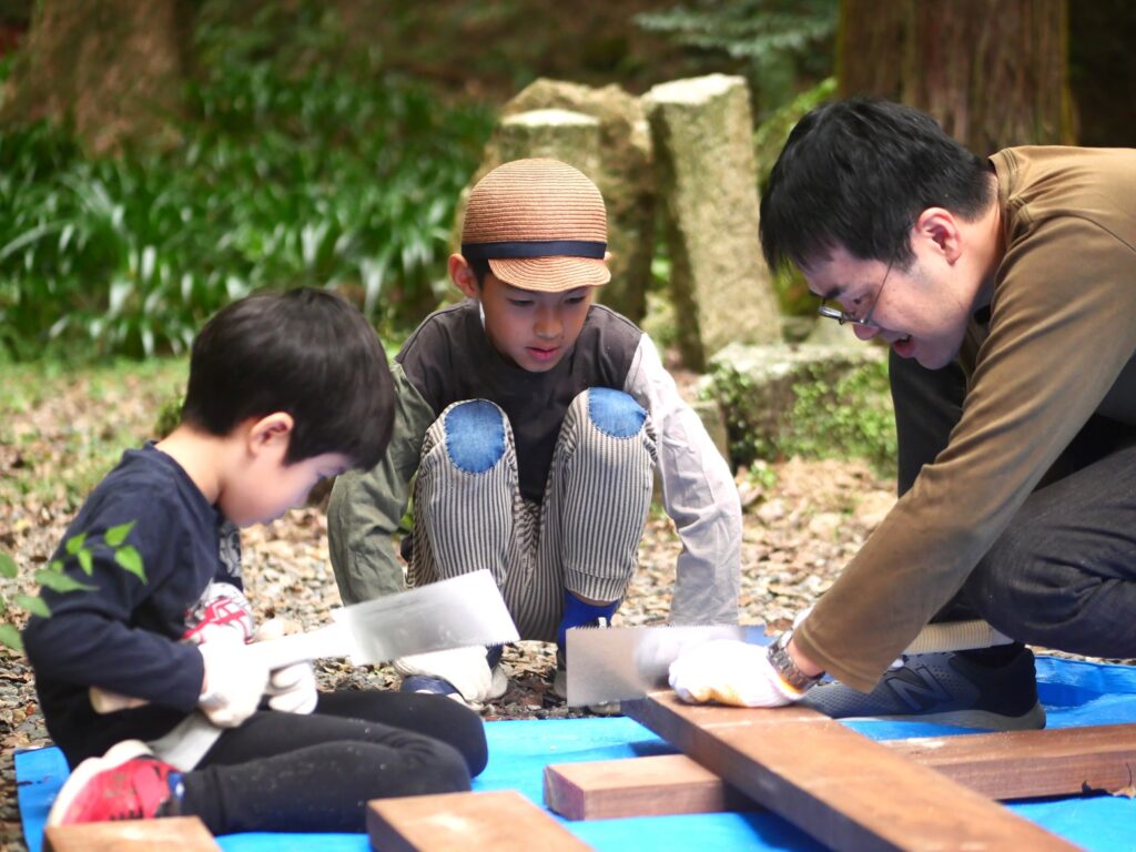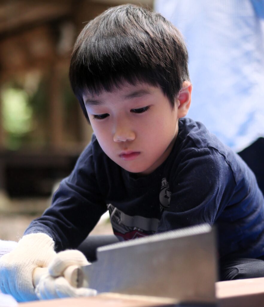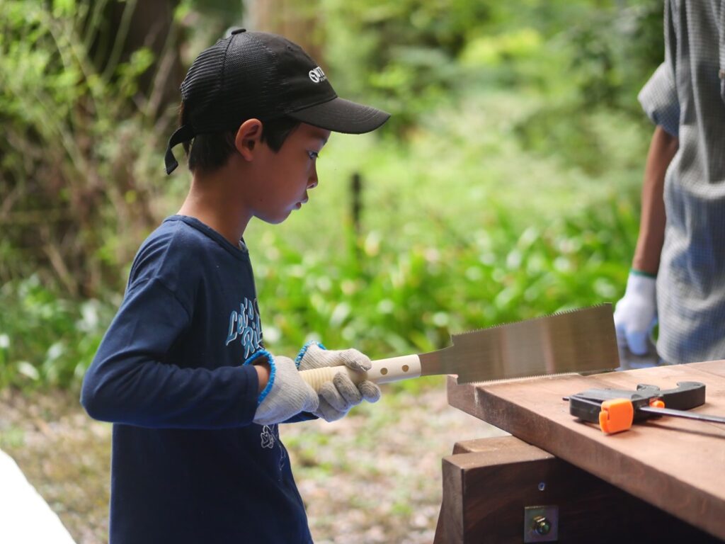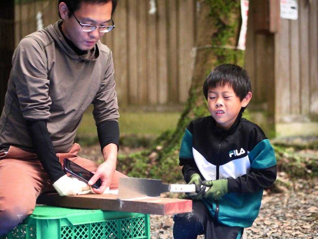 のこぎりの持ち方とか、お父さんに教えてもらって、お父さんに手伝ってもらっています。