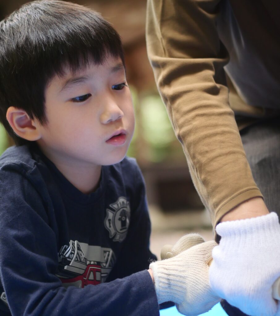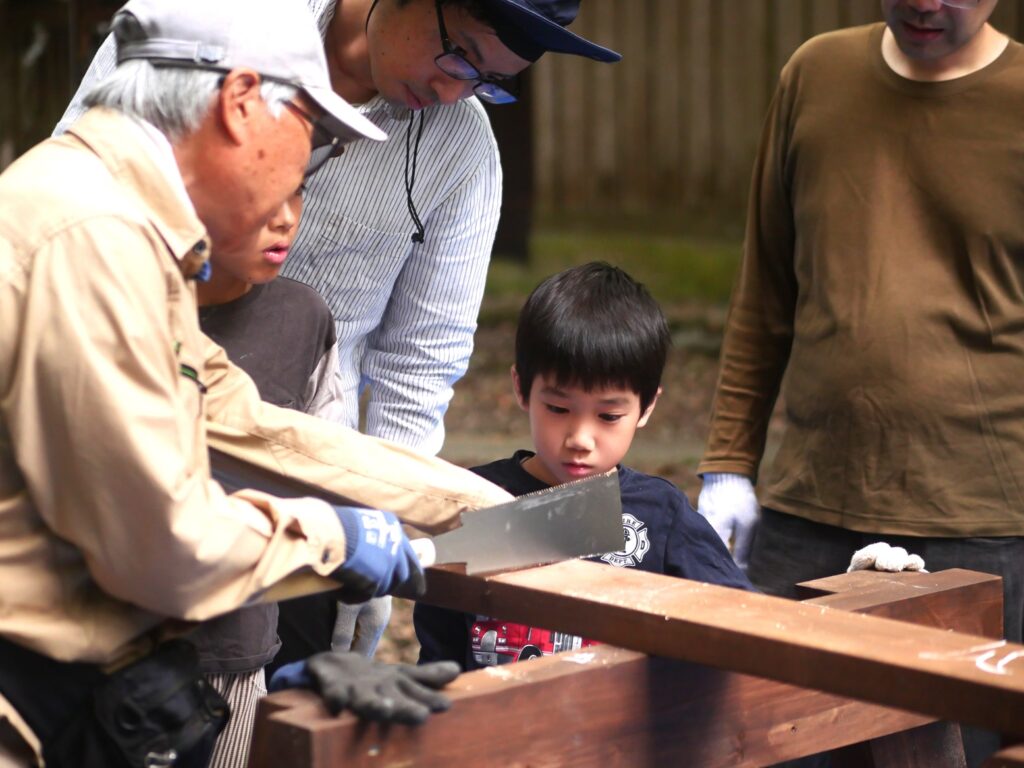 「のこぎりは引いたときに切れます。押すときは軽く、引くときは力強く。」