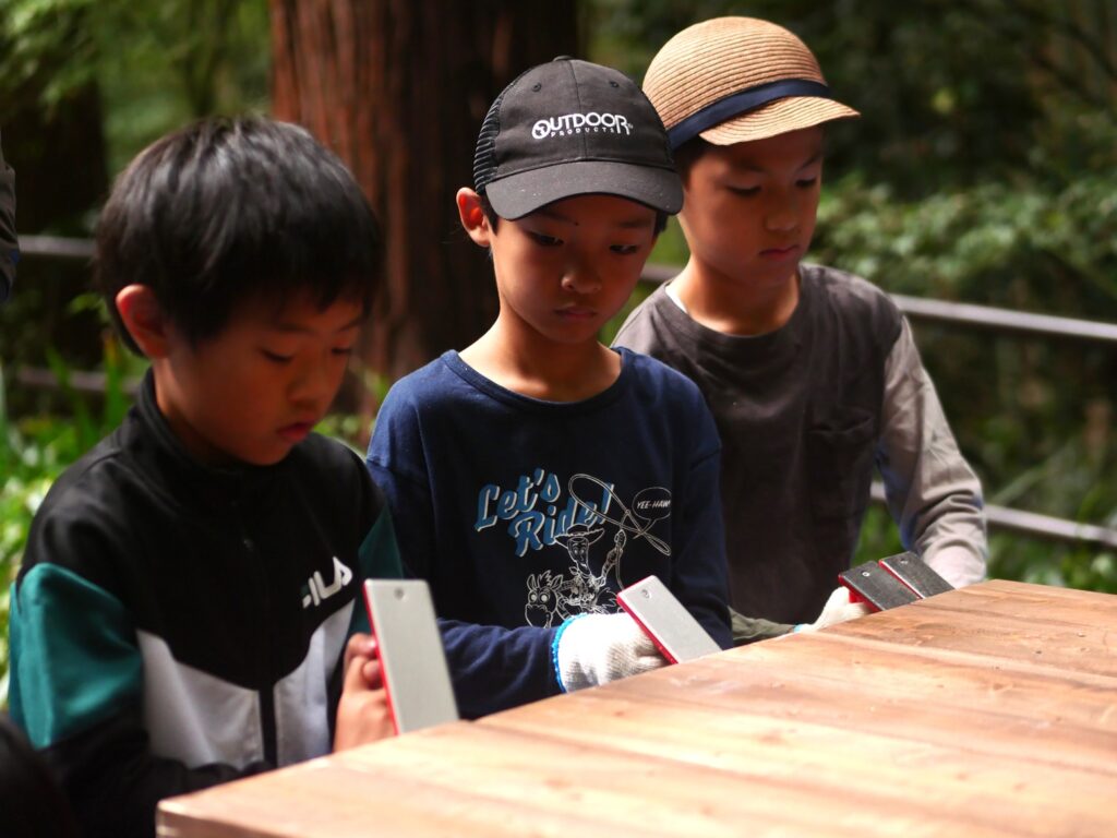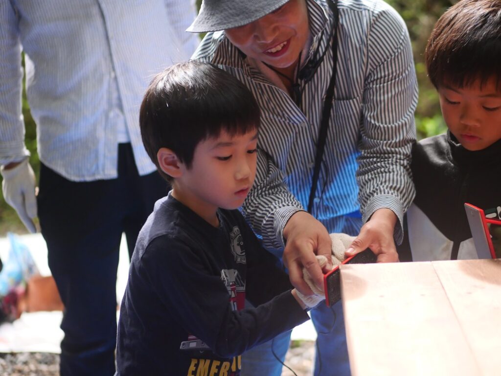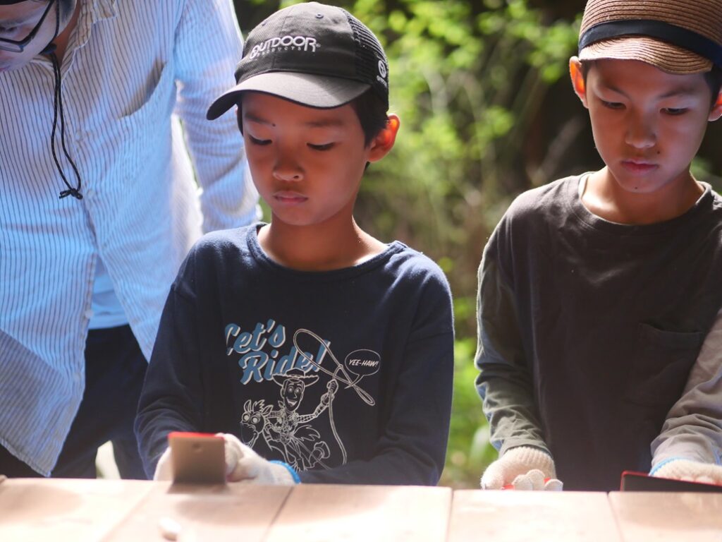 のこぎりで切った木口を滑らかに使ってもらうために、粗目から細目まで事務局がそろえたやすりで、順番に切り落とし面のバリを取ってもらいました。