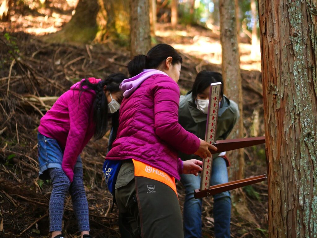 木の山側に立って、約1.2mの高さの直径を胸高直径といって、木の太さを比較するときの目安にしています。